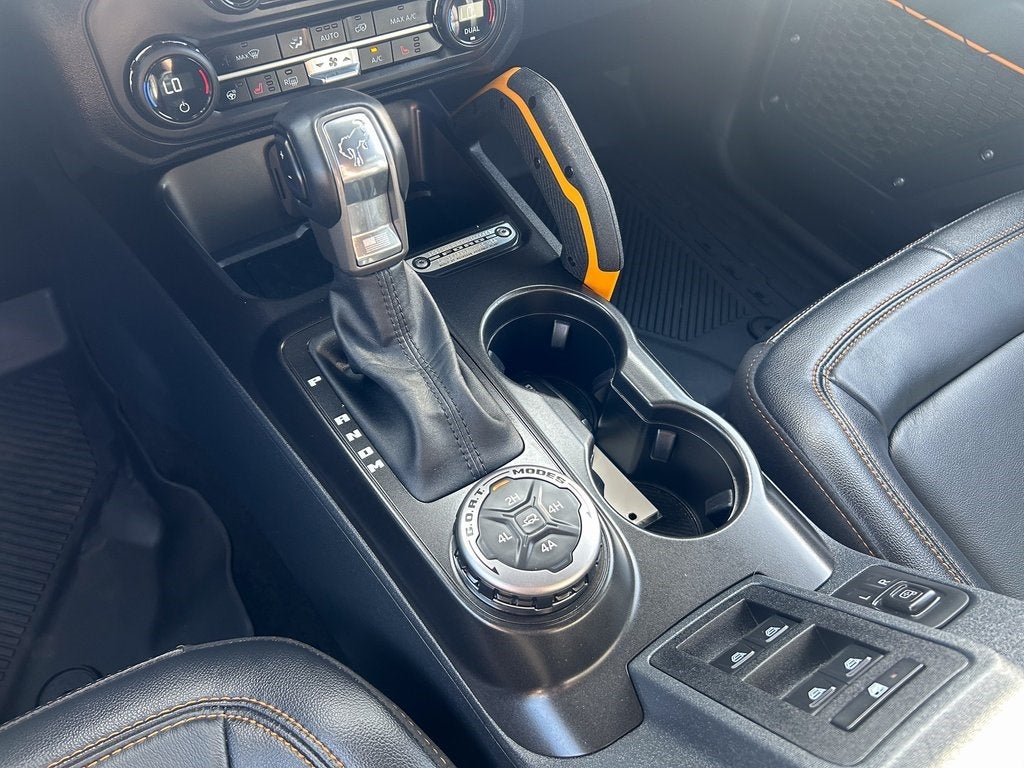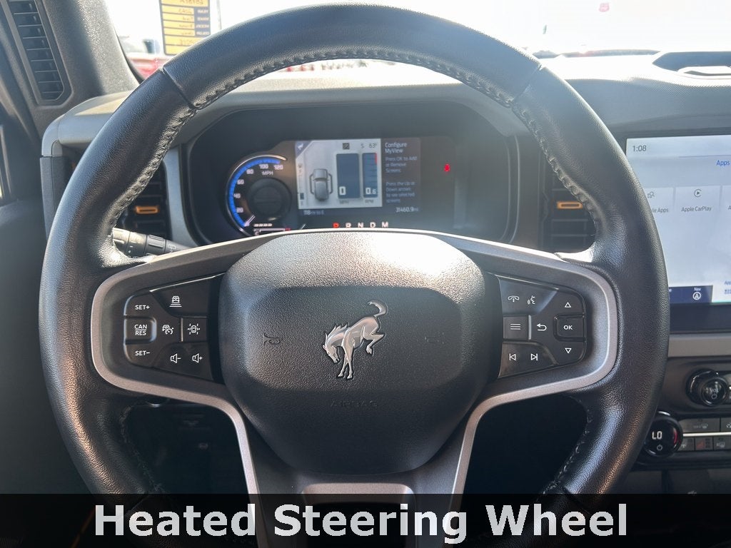 The trail-ready Badlands trim outfits the Bronco with 17-inch aluminum wheels and heavy-duty modular steel bumpers. Inside, you'll find washout rubberized flooring with marine-grade vinyl seats, a leather-wrapped steering wheel, and functional interior accents. The versatile 4-door cabin offers ample space for gear and easy top removal, along with available dual-zone automatic climate control and a premium B&O 7-speaker sound system for your adventures.