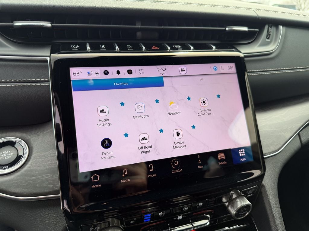 The upscale Overland trim outfits the Grand Cherokee with distinctive 20-inch machined aluminum wheels, all-season touring tires, and exclusive body-color accents with chrome touches. Inside, you'll find premium Nappa leather-trimmed seats with heated, ventilated, and massaging front rows, a heated leather-wrapped steering wheel, and authentic open-pore wood interior trim. The luxurious cabin offers spacious seating for five, along with dual-zone automatic climate control and a premium 19-speaker McIntosh audio system with a 10.1-inch touchscreen.